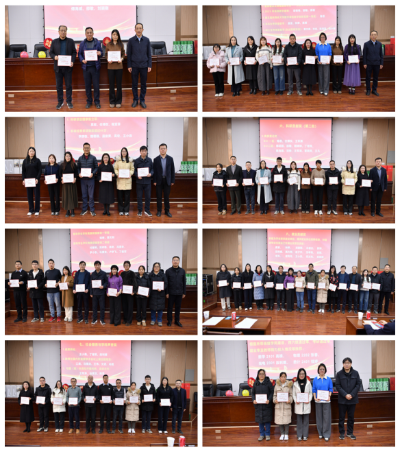 本次表彰共设置九大类奖项,全面覆盖学院的核心工作:一是聚焦教学主业的“教学贡献奖”;二是围绕立德树人根本任务的“人才培养质量奖”;三是助力学科发展的“科研贡献奖”;四是彰显社会责任的“社会服务与学科声誉奖”;五是强化队伍建设的“人才队伍贡献奖”;六是护航学生成长的“就业贡献奖”;七是深耕班级管理的“优秀班主任奖”;八是丰富校园文化的“学生工作贡献奖”;九是赋能学院发展的“公共服务贡献奖”。张君涛副校长及学院领导班子成员依次为获奖集体和个人颁发荣誉证书与奖品,现场掌声雷动,气氛热烈。