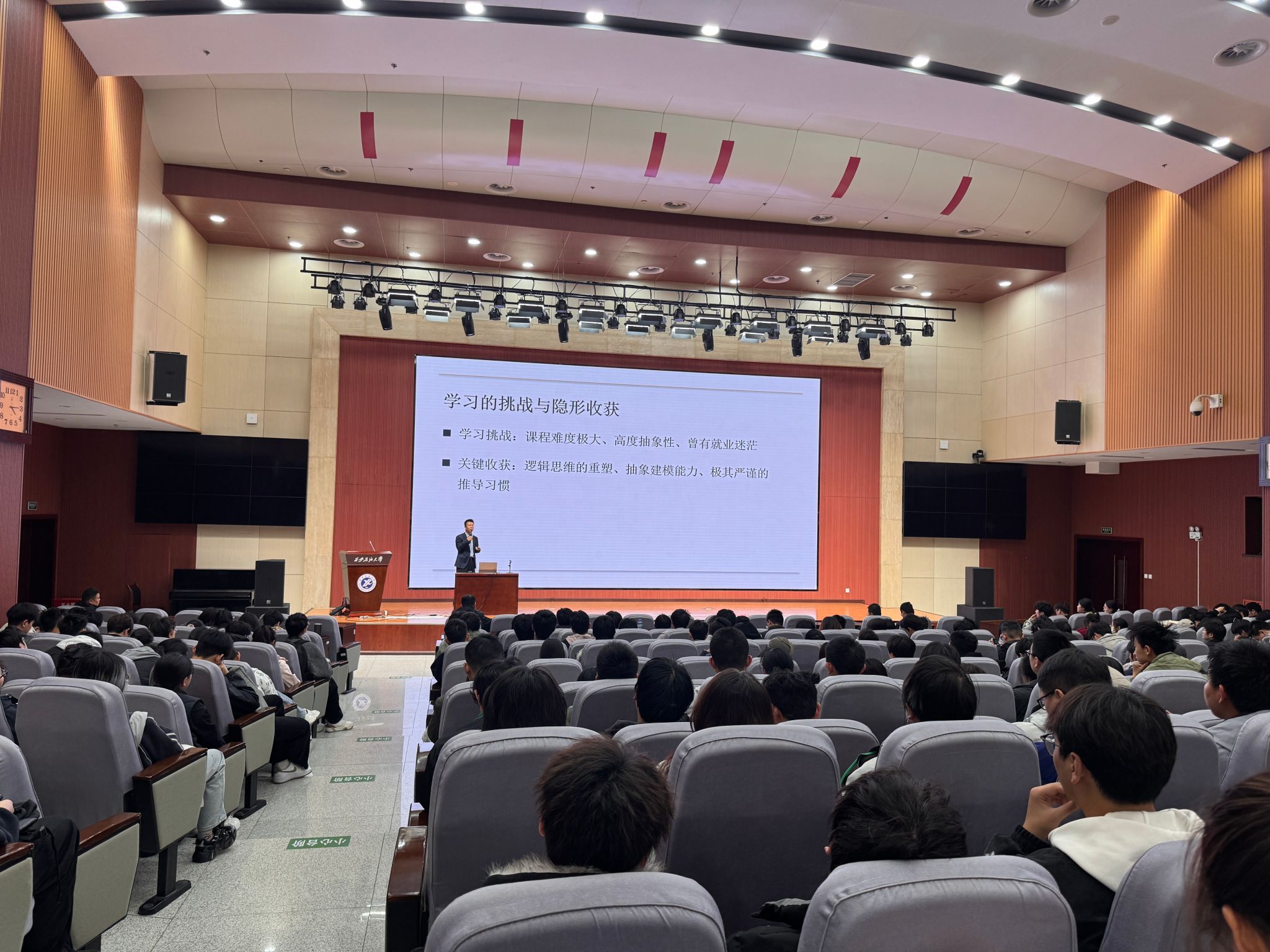 为厚植数理学科根基、赋能学生成长发展,2026年3月25日下午,理学院“数理大讲堂”第七讲在鄠邑校区弘石报告厅开讲。本次讲座特邀理学院优秀校友、国家优青、西北工业大学长聘教授、博士生导师叶坤担任主讲嘉宾,他以“从数学到航空航天——我的求学与科研之路”为题,为400余名师生带来了一场兼具思想深度与实践价值的学术报告。报告会由理学院院长折延宏主持。