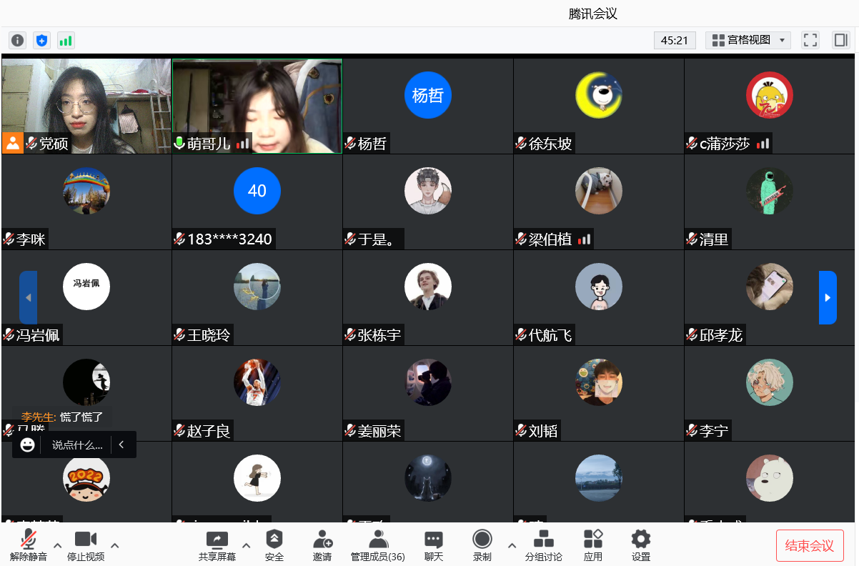2021级研究生以“疫情防控期间感人事迹分享与当前学习生活安排”为主题,参会同学通过分享疫情期间感人事迹、讲述本人当前学习生活安排等方式,积极开展研讨交流、互促互进。会上,同学们逐一分享,感知抗疫英雄的力量,倾听榜样学生的日常,学习抗疫英雄家国情怀,以抗疫英雄为榜样,借鉴优秀学生的学习科研生活规划,努力学习,勇于攀登,以实际行动绽放青春力量,做有理想、有本领、有担当的新时代青年。会议主持人何阳针对班级日常管理、疫情防控、学风班风建设等方面存在的问题进行了重点要求和倡议。
