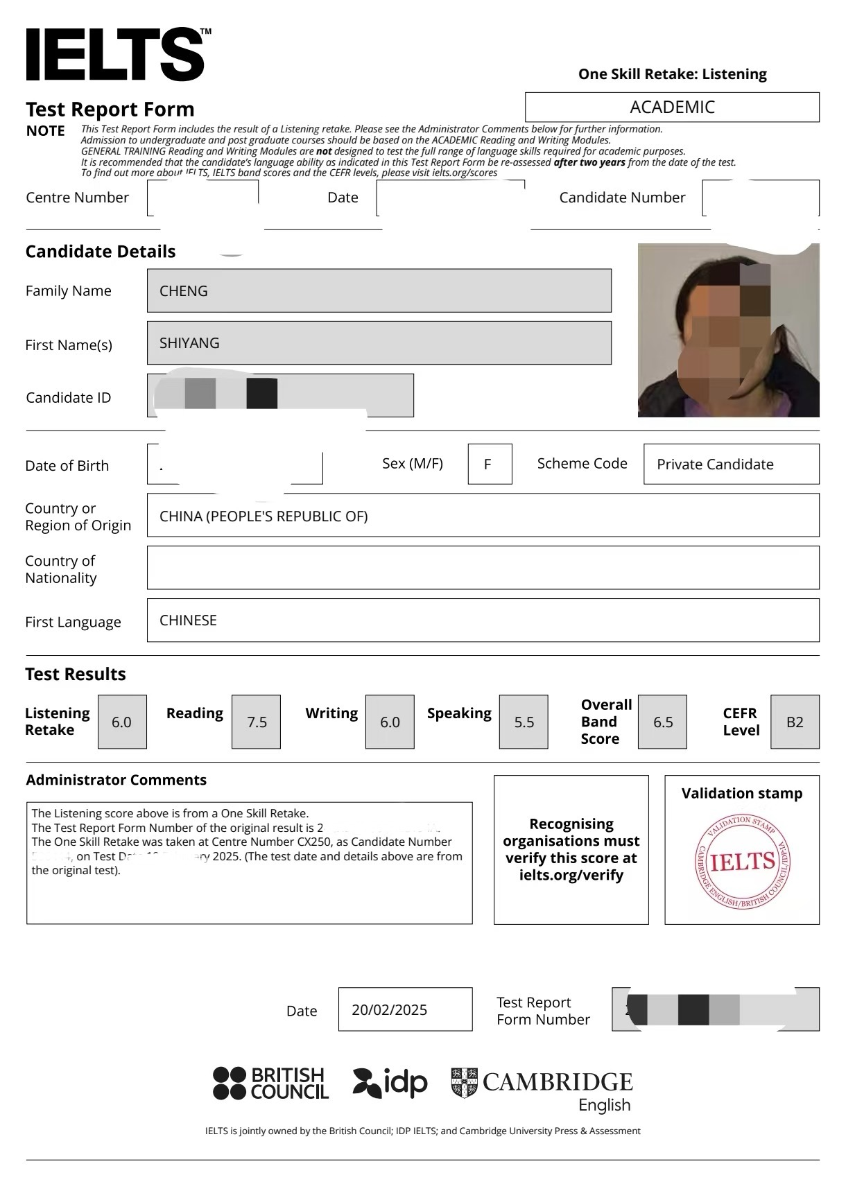 大四上学期:雅思成绩达到6.5,具备英文授课专业申请优势