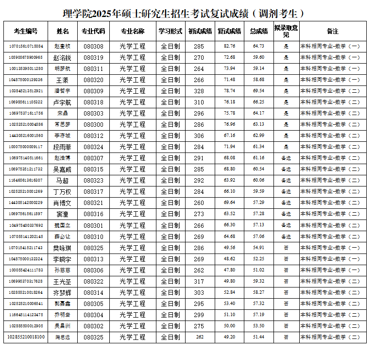 根据教育部及陕西省教育考试院相关文件精神和要求,现将理学院2025年硕士研究生招生复试成绩(光电信息工程、光学工程调剂考生)(第二批)予以公布,如有异议,请联系(029)88382735进行反馈。